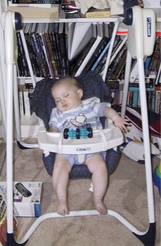 Dad realizes, half a pound before Gray reaches the weight limit for the swing, that the stupid thing reclines. |